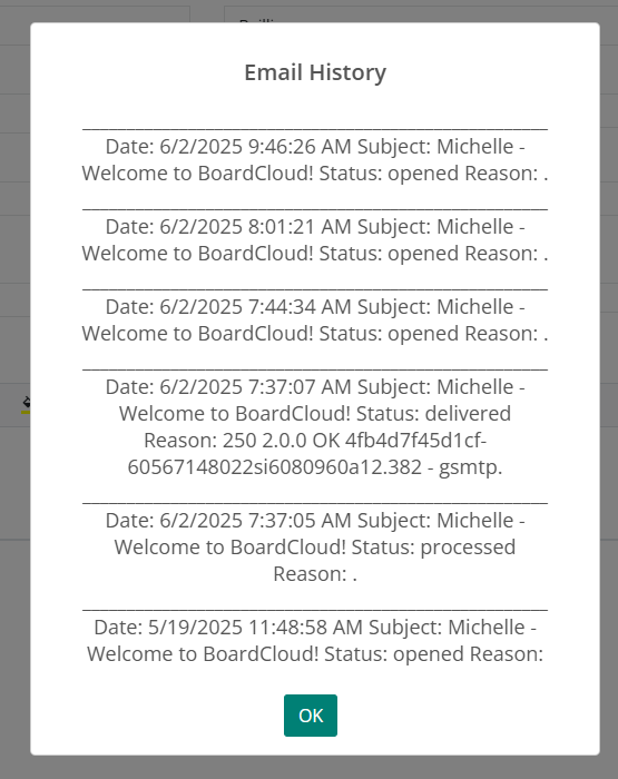 BoardCloud provides a built-in tool that allows administrators to view the email history of individual users. This feature helps you verify whether a user received and opened an email, and can assist in resolving issues related to undelivered or unseen messages.
