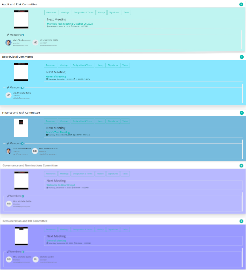 On the Committees page, each committee is displayed with its assigned color. This creates a clear and organized view of all your committees at once, making it easy to quickly spot a specific committee and see at a glance which meetings belong to which committee.