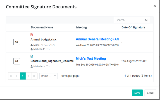 Each committee can have documents marked for signing. The Committee Signatures area lists all documents linked to that committee which require or already contain signatures.