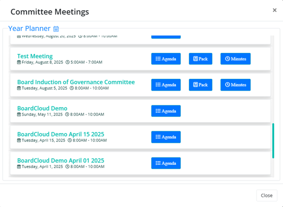 This Committee Meetings panel also holds the board packs and past meeting's minutes.
