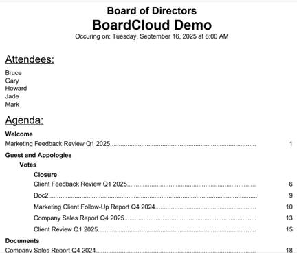 Clicking on the blue Agenda button will open the Agenda Viewer, which displays the agenda in a one page document-style format. This view includes the meeting name, committee, date, attendees, and the full agenda, making it easy to review all key meeting details in one place.