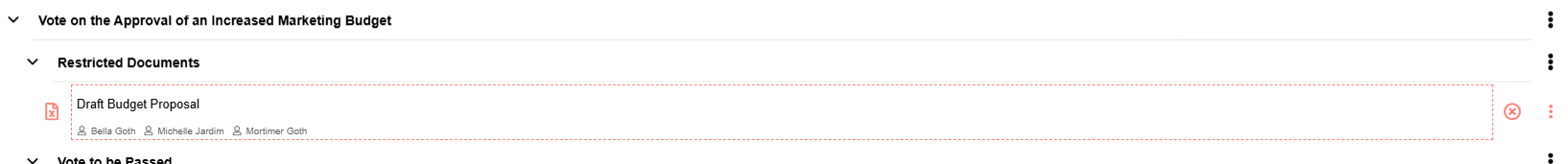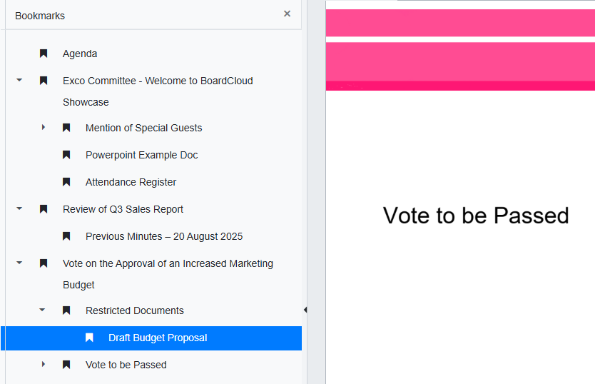 Restricted documents will not appear in the board pack at all for any members, including admins. This ensures that sensitive information is only visible to authorized members, exactly as intended by BoardCloud.