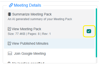 Once a pack is successfully published, a green check mark will appear next to View Meeting Pack in the Meeting Details section. This provides a quick visual confirmation that members can now access the pack.