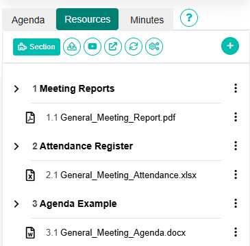 - Click on the Meeting Resources tab at the bottom of the meeting view (between Agenda and Minutes)