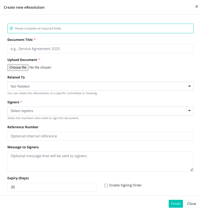 The final step is to select parameters for your new resolution. Here you may add your reference number, include a message for the signatories, set an expiration date for signing ( the default is 30 days), and enable a signing order*