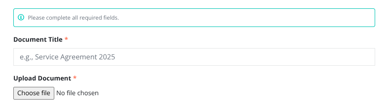 The first step is to Choose your Document Title and upload your document for signature. Word documents and PDFs are supported.