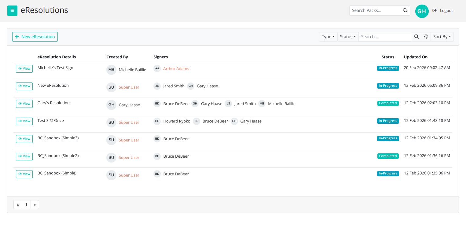 The Resolutions Page is a central hub for all your resolutions. Administrators can create new resolutions, track the status of documents as they go through the signing process, and view the signed documents and audit trail of the signing.
