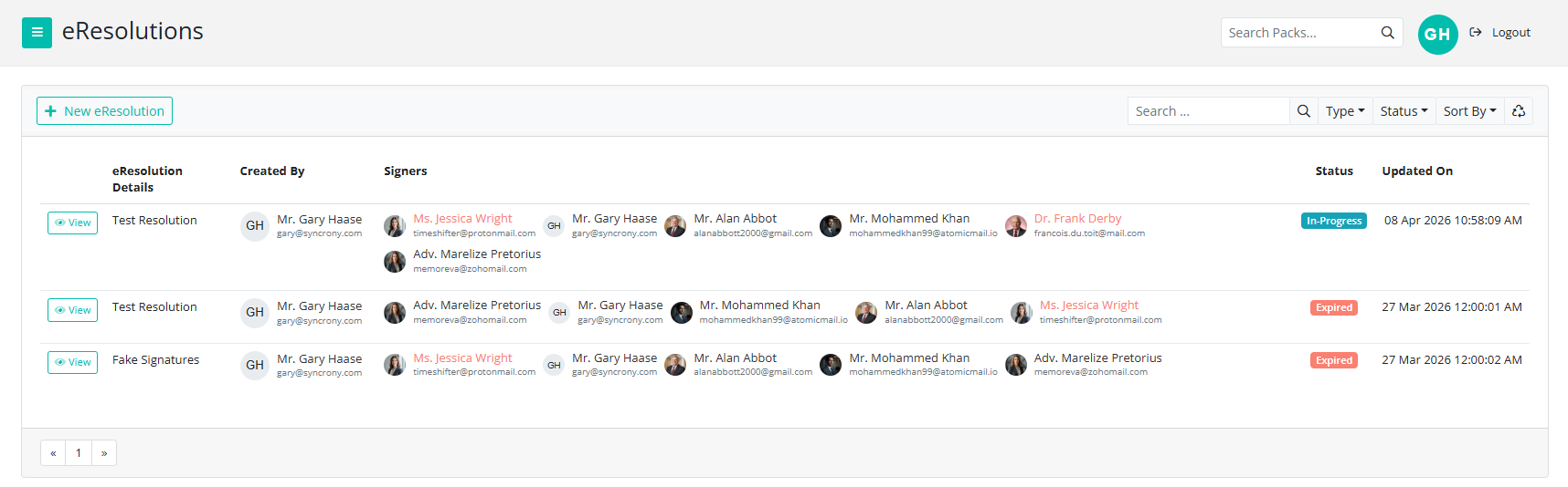 The Resolutions Page is a central hub for your resolutions. Administrators can track the status of documents as they go through the signing process. It shows: