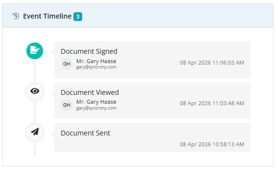 As the signatories view and sign the document both the Signing Progress and Event Timeline trackers will reflect this. Once all the signatories have signed the status on the main page will reflect this.